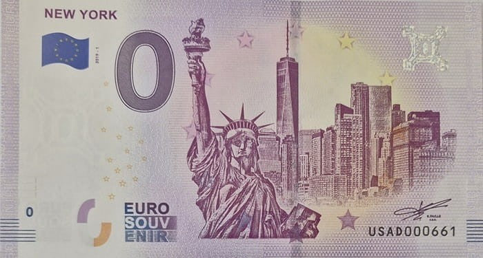 U góry po lewej stronie flaga Unii Europejskiej. Nad nią napis dużymi literami: New York Z prawej strony znak zabezpieczający. Obok flagi nominał banknoty 0. Na grafice stylizowany wizerunek fragmentu Statuy Wolności oraz wieżowce Nowego Jorku. Poniżej seria i nominał banknotu. U dołu po lewej stronie napis w trzech rzędach: EURO / SOUV / ENIER
