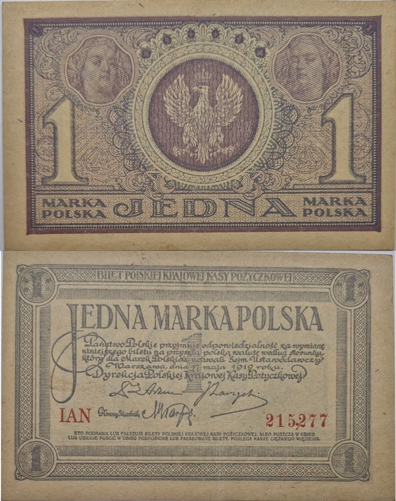 Banknot obiegowy emitowany przez Polską Krajową Kasę Pożyczkową w Królestwie Polskim, emisja 17 maja 1919 r., materiał papier, wymiary 110 mm x 70 mm, stan zachowania +2, real foto