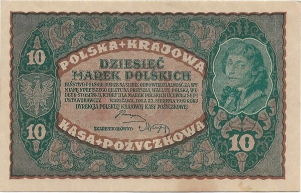 10 marek polskich 1919 - banknot obiegowy emitowany przez Polską Krajową Kasę Pożyczkową w Królestwie Polskim, emisja 23 sierpnia 1919 r. Banknot w stanie 1.