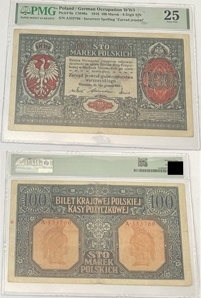100 marek polskich 1916 r. "generał" - banknot obiegowy w Generalnym Gubernatorstwie Warszawskim, emitowane przez Polską Krajową Kasę Pożyczkową, materiał papier, stan zachowania grading PMG 25, real foto