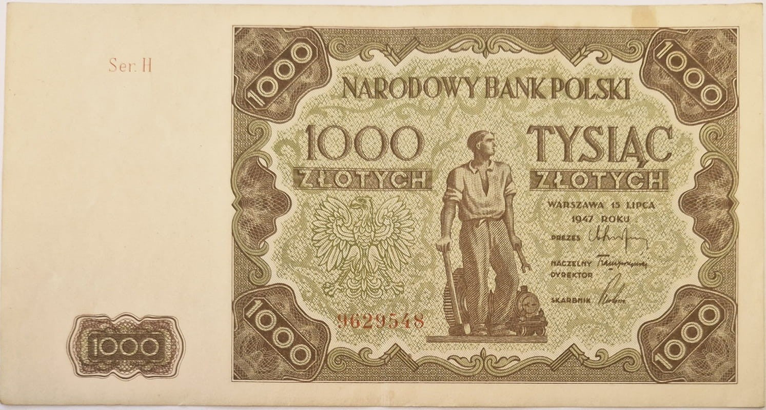 Banknot obiegowy PRL 1000 złotych 1947 rok Polska Rzeczpospolita Ludowa, emitent Narodowy Bank Polski NBP, producent PWPW w Warszawie, materiał papier, wymiary banknotu 182 mm x 97, stan zachowania -2, real foto