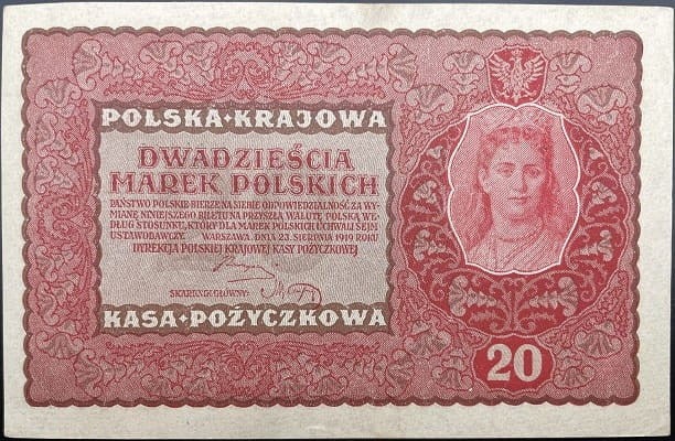 20 marek polskich 1919 - banknot obiegowy emitowany przez Polską Krajową Kasę Pożyczkową w Królestwie Polskim, emisja 23 sierpnia 1919 r. Banknot w stanie 1