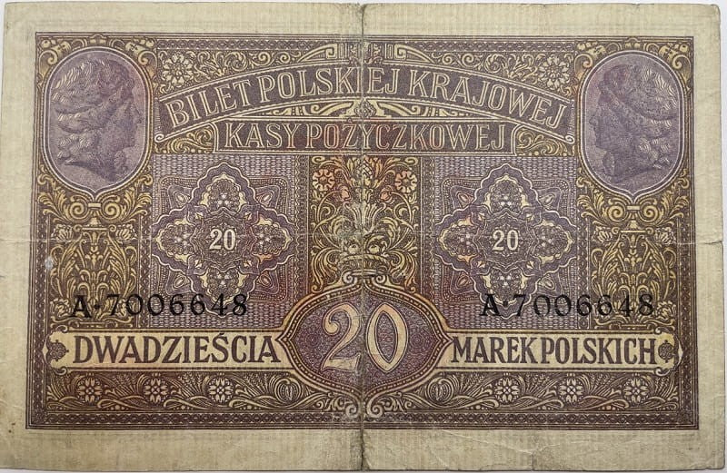 20 marek polskich 1917 r. "generał" - banknot obiegowy w Generalnym Gubernatorstwie Warszawskim, emitowane przez Polską Krajową Kasę Pożyczkową, materiał papier, stan zachowania ok. +4, real foto