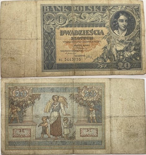 20 zł 1931 r. - banknot obiegowy okresu międzywojennego 20 złotych 1931 r., materiał papier, stan zachowania 4 (mocno obiegowy, ale bez przedarć, z lekkim prześwitem na środku na zgięciach), real foto
