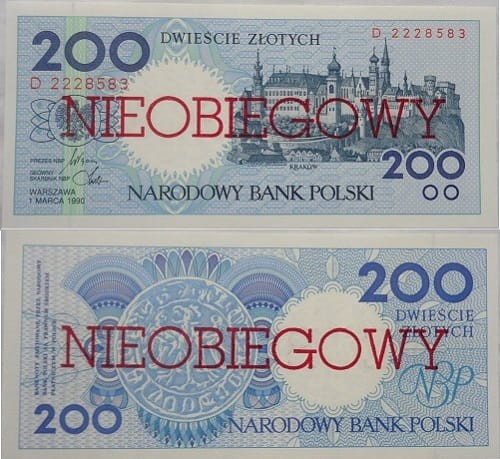 Na drugiej stronie banknotu w lewym dolnym rogu oraz w prawym górnym nominał banknotu 200 złotych. U dołu banknotu napis dużymi literami: Narodowy Bank Polski. Na grafice orzeł piastowski. Na środku przez szerokość banknotu nadruk czerwoną czcionką dużymi literami: Nieobiegowy
