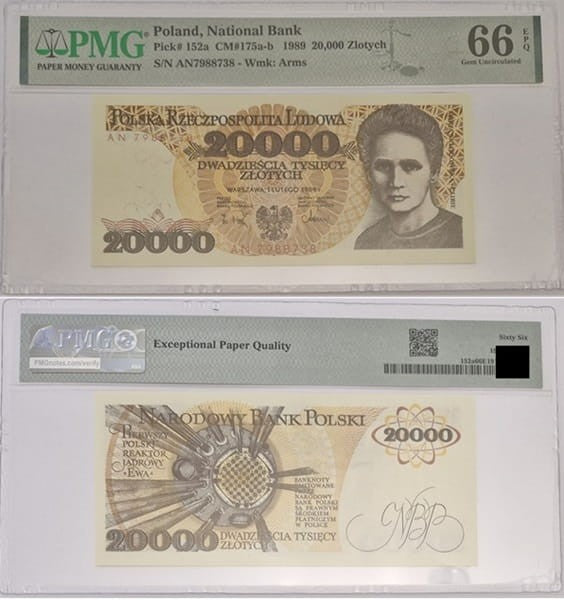 20000 zł Maria Skłodowska-Curie 1989 r. - banknot obiegowy PRL 20000 złotych 1989 r. NBP - Narodowy Bank Polski, producent PWPW -Państwowa Wytwórnia Papierów Wartościowych. Autor projektu Andrzej Heidrich, materiał papier, seria AN, stan zachowania PMG 66 EPQ