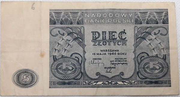 5 złotych 1946 r. - banknot obiegowy z okresu powojennego, emitent Narodowy Bank Polski, materiał papier stan zachowania banknotu 3