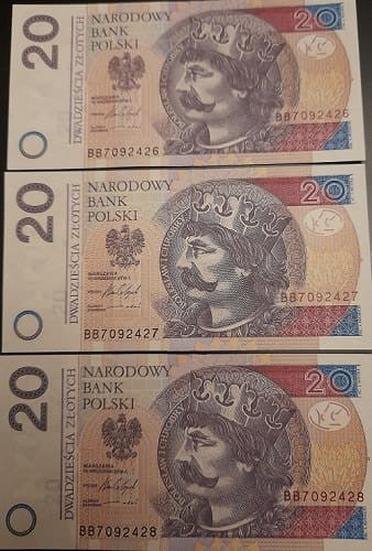 Banknoty 20 zł 2016 Bolesław Chrobry 3 kolejne numery UNC