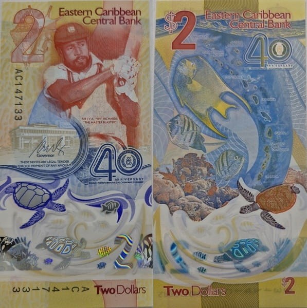 Orientacja pionowa banknotu. U góry po prawej stronie napis: Eastern Caribbean Cetral Bank. W lewym górnym rogu nominał banknotu 2. Pod nominałem czarną czcionką seria i jej numer. U dołu poziomo powtórzona seria i jej numer oraz napisy two dollars. Na grafice banknotu uznawany za jednego z najwybitniejszych krykiecistów minionego stulecia sir I.V.A. "VIV" Richard pseudonim "Master blaster". U dołu stylizowane wizerunki ryb i żółwi oraz nominał 2