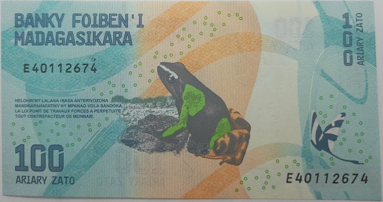 Na rewersie został przedstawiony stylizowany wizerunek Żaby (Mantella baroni) jadowitej. U góry banknotu w lewym rogu napis dużymi literami: BANKY FOIBEN'I MADAGASIKARA (Centralny Bank Madagaskaru). Poniżej numer i seria banknotu, który został powtórzony w prawym dolnym rogu banknotu. W lewym dolnym rogu oraz w prawym górnym rogu nominał banknotu 100 Ariary