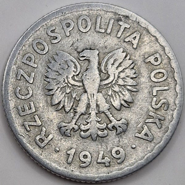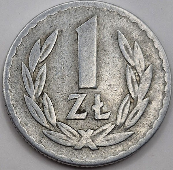 Jedyna moneta obiegowa o nominale 1 złotych od 1949 bit w miedzioniklu, kolejne tego typu monety bite w aluminium z napisem Polska Rzeczpospolita Ludowa