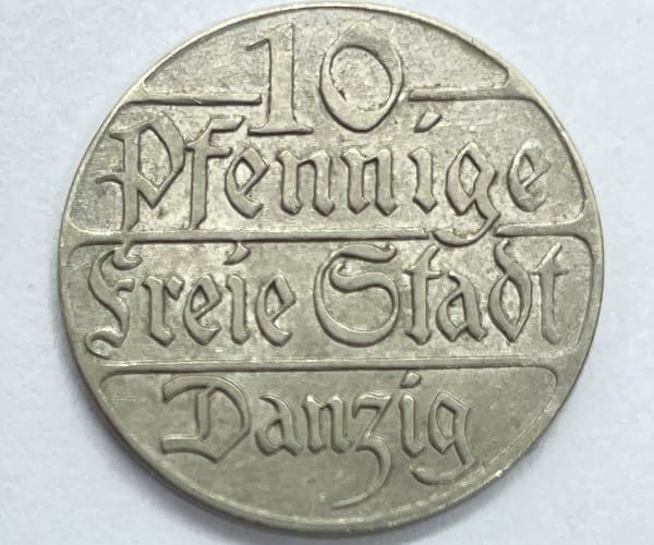 Na rewersie monety u góry jej nominał 10 oraz poniżej słownie między liniami w kilku rzędach napisy: pfenninge / freie Stadt / Danzig (Wolne Miasto Gdańsk)