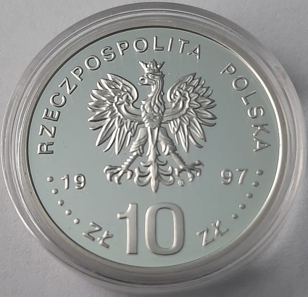 Srebrna moneta kolekcjonerska z kategorii monety 10 złotych, emitent NBP - Narodowy Bank Polskim producent Mennica Polska S.A., temat indywidualny, nominał monety 10 złotych, stempel lustrzany, metal / stop srebro Ag925, średnica 32 mm, masa 14,14 gram, rok emisji 1997, wielkość nakładu 20 000 sztuk, projektant rewersu monety Ewa Tyc-Karpińska, moneta w stanie menniczym w kapslu ochronnym, stan zachowania L/L