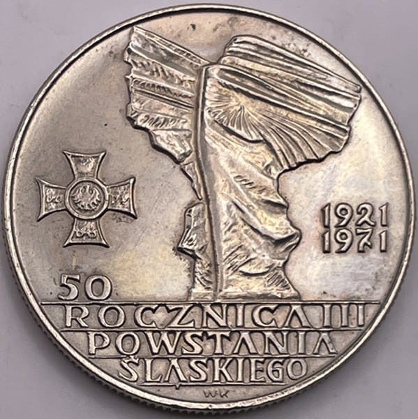Na rewersie pomnik Powstania Śląskiego, obok daty w dwóch rzędach 1921 / 1971. W dolnej części monety w czterech rzędach napis: 50 / ROCZNICA / POWSTANIA / ŚLĄSKIEGO. Pod napisem monogram projektanta WK.