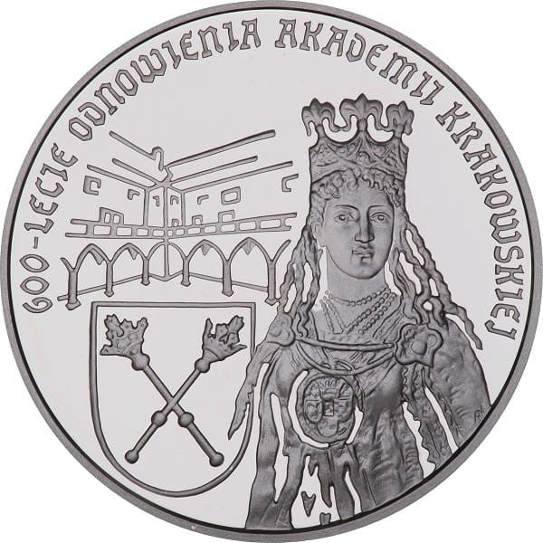 Rewers: Na rewersie monety stylizowana półpostać królowej Jadwigi. W otoku napis półkolem: 600-LECIE ODNOWIENIA AKADEMII KRAKOWSKIEJ.