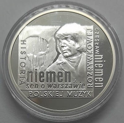 Czesław Niemen okrągła 2009 r. - srebrna moneta kolekcjonerska 10 złotych NBP, producent Mennica Polska S.A. z serii Historia Polskiej muzyki rozrywkowej, stempel lustrzany, moneta w kwadratowym pudełku, stan zachowania L/L