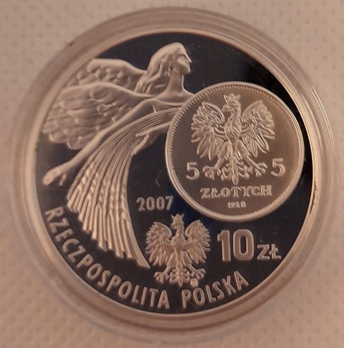 Na awersie z prawej strony wizerunek awersu monety 5 zł z 1928 roku, z lewej strony zaś stylizowany wizerunek popiersia Nike z kłosami zboża. Poniżej orzeł ustalony dla godła Rzeczypospolitej Polskiej. Z prawej strony orła napis: 10 ZŁ. Powyżej orła rok emisji: 2007. U dołu półkolem napis dużymi literami: Rzeczpospolita Polska. Pod lewą łapą orła znak mennicy: m/w