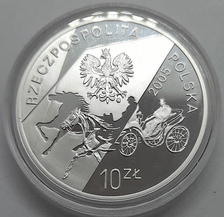Awers: Wizerunek orła ustalony dla godła Rzeczypospolitej Polskiej, powyżej półkolem napis: RZECZPOSPOLITA POLSKA. Poniżej orła stylizowany wizerunek dorożki i koni. Powyżej dorożki z prawej strony ukośnie oznaczenie roku emisji: 2005. U dołu napis: 10 ZŁ. Pod lewą łapą orła znak mennicy: m/w.