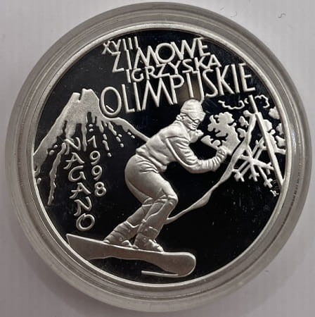 10 złotych XVIII Zimowe Igrzyska Olimpijskie Nagano 1998 r. - srebrna moneta kolekcjonerska, producent Mennica Polska S.A., z serii Igrzyska olimpijskie, stempel lustrzany, moneta w stanie menniczym w kapslu ochronnym, stan zachowania L/L