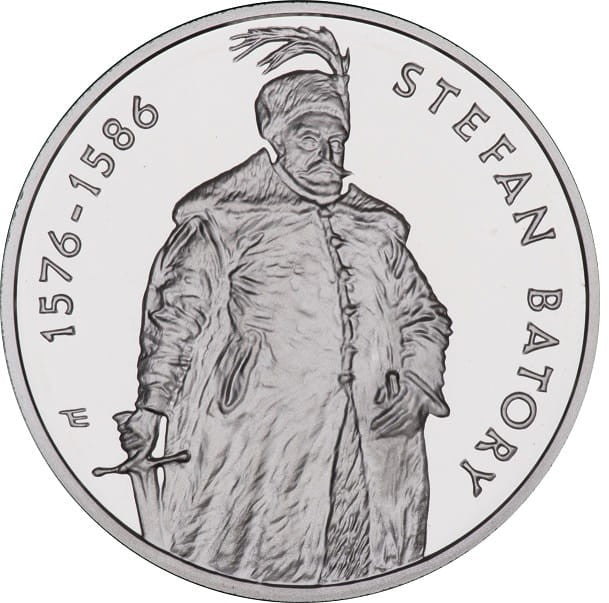 Na rewersie półpostać Stefana Batorego. W lewym ręku trzyma miecz. Z lewej strony monety napis: 1576-1586 oraz inicjały projektanta. Z prawej strony przy krawędzi monety napis: STEFAN BATORY.