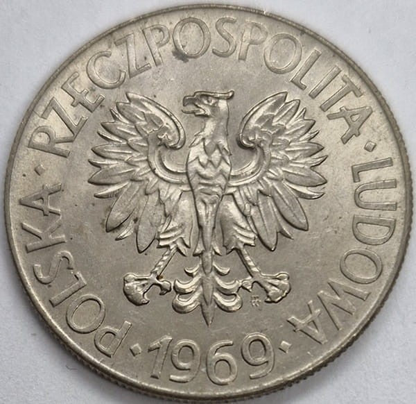 Na awersie w jej centralnym punkcie orzeł bez korony. Przy krawędzi monety w otoku napis dużymi literami: Polska Rzeczpospolita Ludowa. Każde słowo oddzielone koralikiem oraz oddzielony od napisu na początku i na końcu koralikiem rok emisji monety 1969. Przy lewej łapie orła znak mennicy: m/w