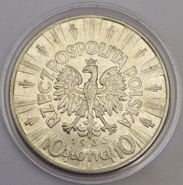 10 złotych 1936 r. - srebrna moneta okolicznościowa Ag750, z serii monet Józef Piłsudski, stempel zwykły, moneta w kapslu ochronnym, stan zachowania -2/+3