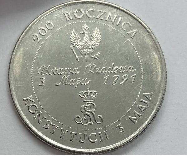 Na rewersie monety na wyodrębnionym polu napis w górnej części monety napis 200 ROCZNICA, w dolnej części monety napis: KONSTYTUCJI 3 MAJA. W centralnej części monety napis: Ustawa Rządowa / 3 Maja 1791