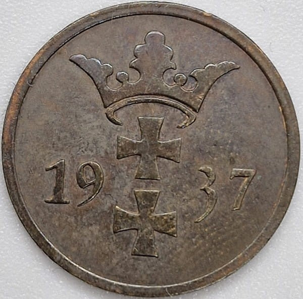 2 fenigi 1937 r. - moneta obiegowa Wolnego Miasta Gdańsk wprowadzona do obiegu 1937 roku, stempel zwykły, metal brąz, stan zachowania 2/+2, real foto