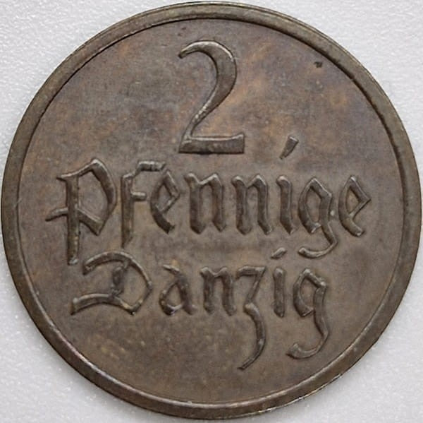 Na rewersie u góry jej nominał 2 oraz poniżej słownie napis z dużej litery: Pfennige. Poniżej również z dużej litery napis: Danzig