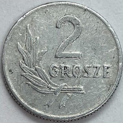 2 grosze 1949 r. - moneta obiegowa z okresu II Rzeczpospolitej Polskiej, metal aluminium, emitent Bank Polski, stempel zwykły, stan zachowania: moneta z obiegu, zdjęcie przykładowe prezentacyjne