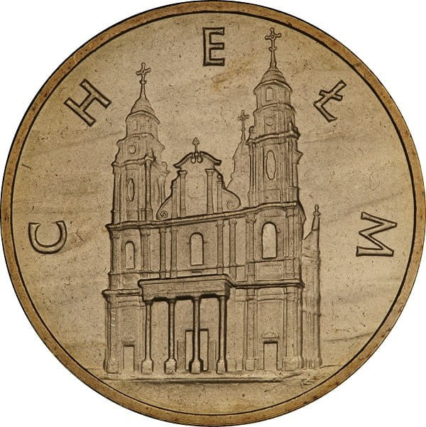 Na rewersie w jej centrum widnieje stylizowany wizerunek Bazyliki pod wezwaniem Narodzenia Najświętszej Marii Panny. U góry monety przy jej półkolem napis: CHEŁM