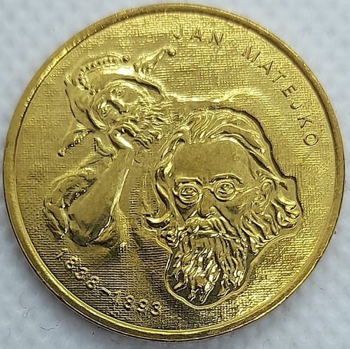 Na rewersie stylizowana głowa z podobizną Jana Matejki, nad nią stylizowana postać stańczyka. Po prawej stronie u góry napis dużymi literami: Jan Matejko. U dołu po lewej stronie daty życia artysty 1838-1893