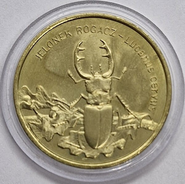 Na rewersie został umieszczony stylizowany chrząszcz Jelonek Rogacz na gałązce dębu na której widać liście oraz żołędzie. W górnej części monety przy jej rancie napis: JELONEK ROGACZ - Lucanus cervus