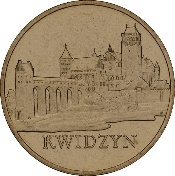 Na rewersie w jej centrum widnieje stylizowany wizerunek zespołu katedralno-zamkowego w Kwidzyniu. U dołu monety poziomo napis dużymi literami: KWIDZYN