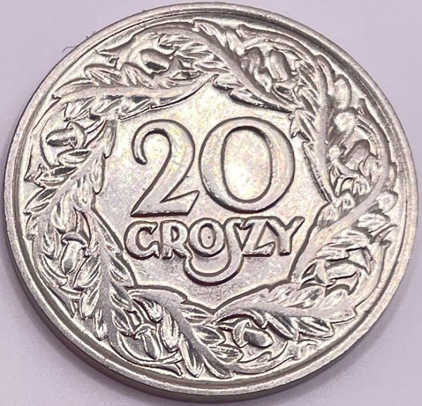 20 groszy 1923 r. - moneta obiegowa okresu międzywojennego emitowane przez Bank Polski, nikiel wybita w mennicy szwajcarskiej Huguenin Frs (Le Locie) stempel zwykły,, stan zachowania 1