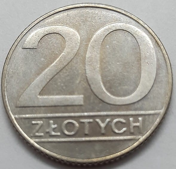 20 złotych 1989 r. - moneta obiegowa PRL 20 złotych 1989 r., materiał miedzionikiel (MN), stempel zwykły, stan zachowania: -1, zdjęcie przykładowe własne, zbliżony wygląd