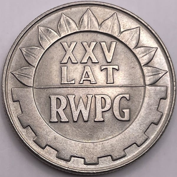 Na rewersie monety w jej centrum napis XXV lat / RWPG. Napis XXV lat jest w górnej części koła, a na jej zewnętrznej stronie płatki słonecznika. W dolnej części koła napis RWPG w kole zębatym