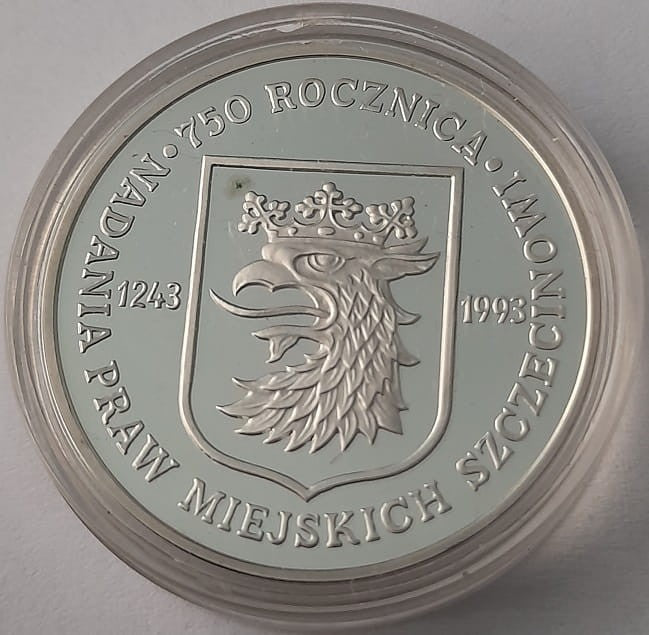 Rewers: Na rewersie monety wokół jej rantu napis: NADANIA PRAW MIEJSKICH SZCZECINOWI. Przed napisem i po napisie koralik, a pomiędzy napis: 750 ROCZNICA. W centralnym miejscu monety herb Szczecina, czyli głowa orła w koronie. Po lewej stronie monety data 1243, po prawej stronie 1993