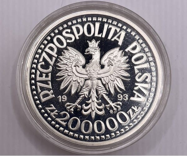 Na awersie orzeł w korony, godło ustanowione dla Rzeczpospolitej Polskiej. W otoku monety przy jej rancie napis dużymi literami: Rzeczypospolita Polska. U dołu monety jej nominał 200 000 zł. Po bokach orła przedzielony rok emisji monety 19/93. W otoku monety ozdobne koraliki. Pod lewą łapą orła znak mennicy: m/w
