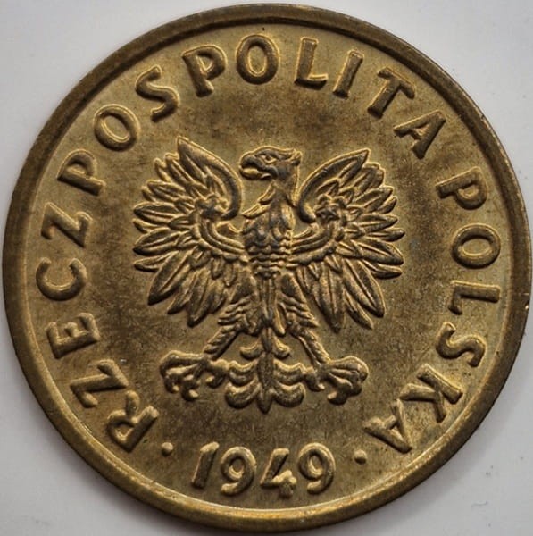 Na awersie w centrum widnieje orzeł bez korony ustanowiony dla godła Rzeczypospolitej Polskiej. W otoku monety przy jej rancie napis dużymi literami: Rzeczpospolita Polska oraz rok emisji monety 1949 przy rancie u dołu między kropkami. Standardowo dla tej monety brak znaku mennicy