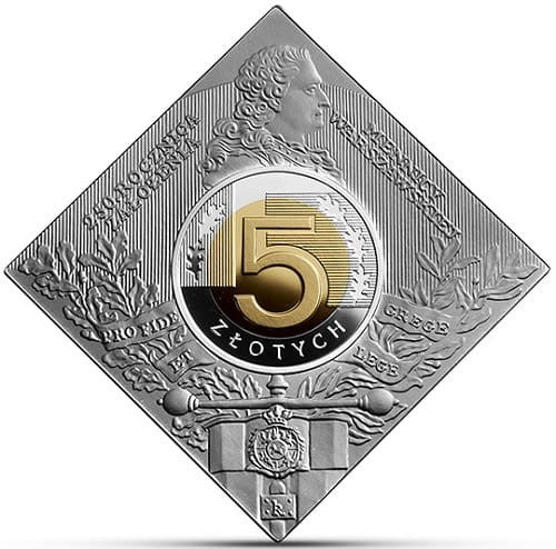 Na rewersie monety przedstawiono wizerunek popiersia króla Stanisława Augusta Poniatowskiego dłuta Holzhaussera. U dołu monety przedstawiono stylizowaną maszynę menniczą z epoki tzw. balansjerki. Po bokach u góry maszyny szarfy z napisami Pro Fide, Grege Et Lege (Za wiarę, lud i prawo) z medalu sławiącego wznowienie Orderu Orła Białego.