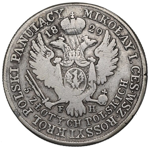 5 złotych 1829 - monety z Królestwa Polskiego pod zaborem rosyjskim, stempel zwykły, stan zachowania 3
