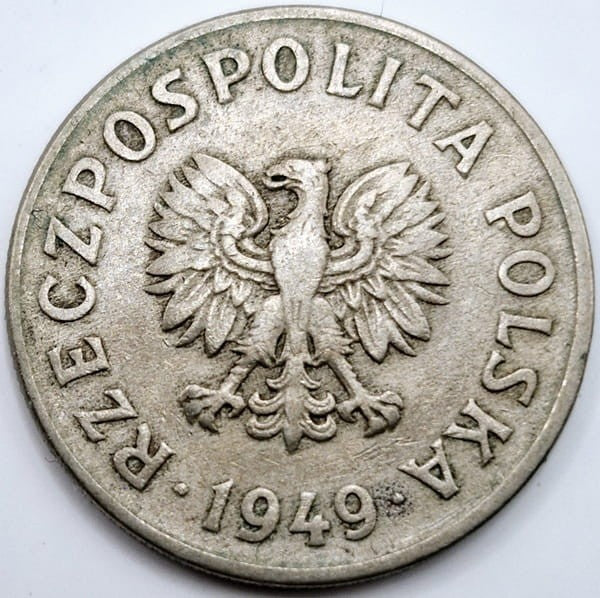 Na awersie w centrum widnieje orzeł bez korony ustanowiony dla godła Polskiej Rzeczpospolitej Ludowej. W otoku monety przy jej rancie napis dużymi literami: Rzeczpospolita Polska oraz u dołu rok emisji monety 1949 zaczyna się i kończy koralikiem. Wersja gdzie pod lewą łapą orła nie znajduje się znak mennicy