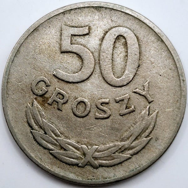 Jedyna moneta obiegowa o nominale 50 groszy od 1949 bit w miedzioniklu, kolejne tego typu monety bite w aluminium z napisem Polska Rzeczpospolita Ludowa