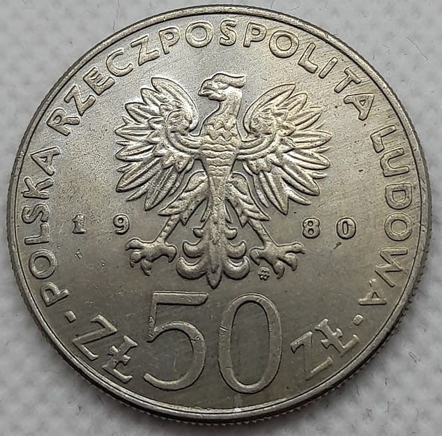 Na awersie monety w jej centralnym miejscu orzeł bez korony godło ustanowione dla Rzeczpospolitej Polski Ludowej. Po bokach orła rok emisji monety 1980. W otoku monety przy jej rancie napis: POLSKA RZECZPOSPOLITA LUDOWA oraz nominał monety w zapisie ZŁ 50 ZŁ. Pod lewą łapą orła znak mennicy: m/w