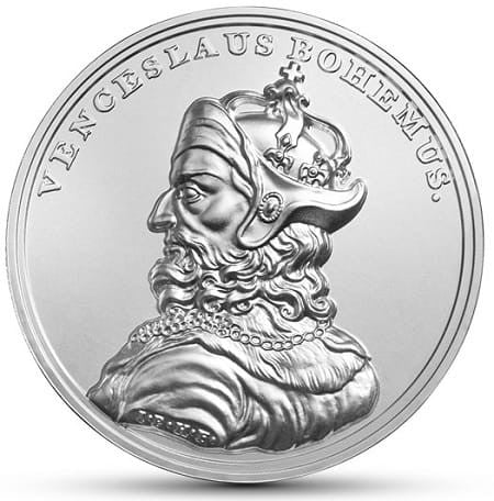 Na boku monety napis dużymi literami: SKARBY STANISŁAWA AUGUSTA * WACŁA II CZESKI *, z rantem