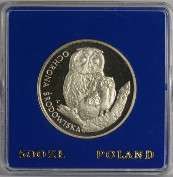 Srebrna moneta kolekcjonerska z kategorii srebrne monety PRL, producent Mennica Polska S.A., projektant Ewa Tyc-Karpińska, seria monet Ochrona środowiska, w kwadratowym niebieskim pudełku, stempel lustrzany, stan zachowania menniczy, real foto