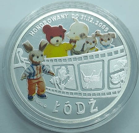Na rewersie Miś Uszatek i jego przyjaciele, a przy nich taśma filmowa. U góry monety przy jej rancie napis: Honorowany do 31.12.2009. U doły monety napis dużymi literami ŁÓDŹ, a po lewej stronie znak mennicy i próba Ag500
