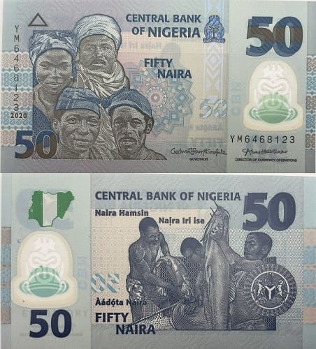 Na grafice przedstawiono rybaków ze złowionymi okazami. W lewym dolnym rogu oraz w prawym górnym nominał banknotu. U góry dużymi literami poziomo napis: Central Bank of Nigeria