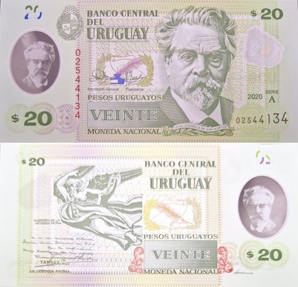 Banknot 20 pesos urugwajskich z kategorii obiegowe banknoty świata kontynent Ameryka Południowa, państwo Urugwaj, rok emisji 2020, materiał papier, stan zachowania UNC / stan 1